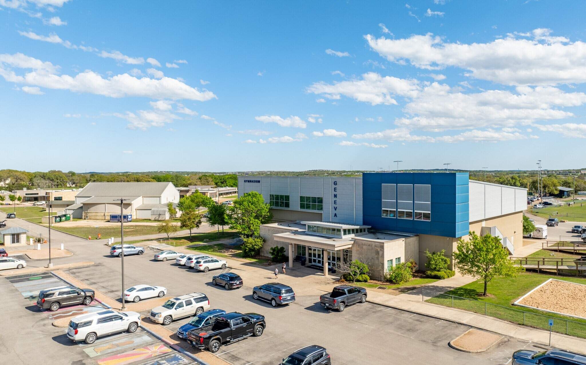 The Gymnasium Building at the Geneva School of Boerne was the first major step in implementing the campus’s 30-acre master plan, providing a UIL-compliant competition gym, locker rooms, a weight room, and support spaces to serve more than 600 K–12 students. Designed for both daily physical education needs and competitive athletic events, the facility seats up to 300 spectators and is strategically located near outdoor fields to allow after-hours use without disrupting campus operations. A modified pre-engineered metal structure with translucent glazing brings in natural daylight while minimizing glare, and exterior materials offer a refined, modern interpretation of Texas Hill Country vernacular. All systems and materials were selected using sustainability best practices, including the use of locally sourced stone and strategies that enhance indoor environmental quality, energy efficiency, and long-term durability.